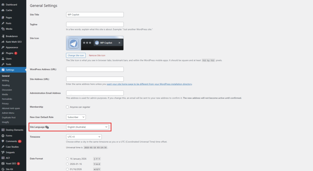 Scroll down until you find the Site Language dropdown menu. By default, it will show “English (United States)”.