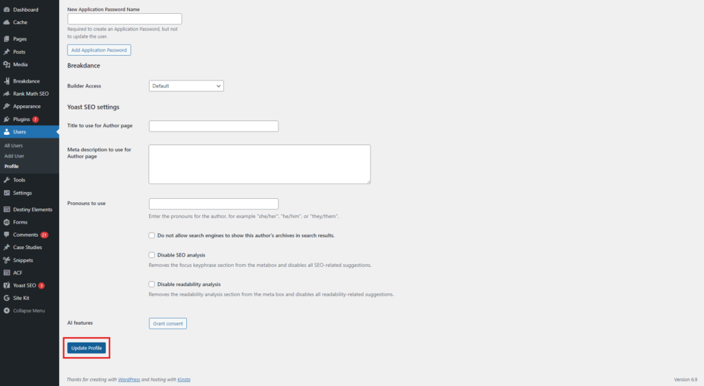 Click the Update Profile button at the bottom of the page to save your changes.