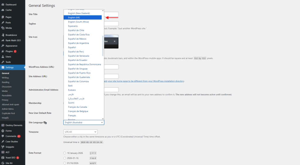Problem: You don’t see English (UK) in the Site Language dropdown.