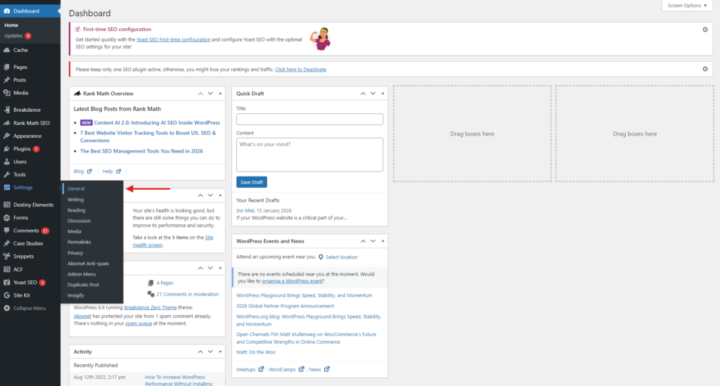 Log in to your WordPress dashboard. In the left sidebar menu, click Settings, then select General.